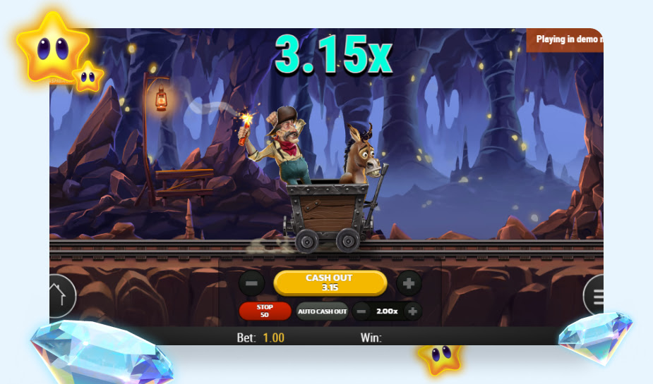 In Miner Donkey Rider zit een mijnwerker met een dynamietstaaf in de hand, samen met zijn ezel, in een mijnkarretje dat over de rails binnen een mijn rijdt. Terwijl ze verder rijden, loopt de vermenigvuldiger op. De uitdaging is simpel maar zenuwslopend: druk op ‘Cash Out’ voordat de dynamiet ontploft. Wacht je te lang, dan verlies je je inzet van deze casino game!