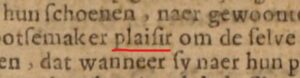 De s wordt in Nederland op een gegeven moment vervangen door de z en begint al een beetje op het woord plezier te lijken. Vanaf ongeveer 1700 is pleizier de meest gebruikte vorm om aan te geven dat een ontmoeting, spel of andere gebeurtenis iemand behaagt, bevalt, plezier geeft.