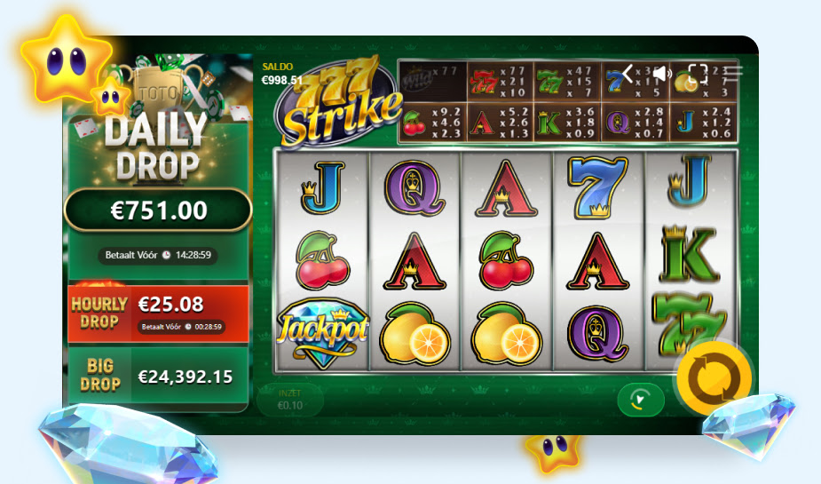 777 Strike is alweer een aantal jaar te vinden in de legale Nederlandse online casino’s. Het spel werd namelijk uitgebracht in april 2021. Het uitbetalingspercentage is vastgesteld op 95,8% en op dit moment wordt het spel ook bij de meeste casino’s tegen dit uitkeringspercentage aangeboden. De minimale inzet bedraagt € 0,10. De maximale inzet verschilt nogal. Bij Casino777 kan je maximaal € 50 per draai inzetten en bij TOTO en Comeon Casino maximaal € 100. Als je besluit 777 Strike bij Kansino te spelen kan je per draai € 500 inzetten. Dit zijn forse bedragen en heeft weinig te maken met veilig en verantwoord spelen. De maximale winst is vastgesteld op 2.830x de inzet. De volatiliteit ligt bij 777 Strike op gemiddeld tot hoog. Dit houdt in dat deze gokkast relatief weinig winnende combinaties uitkeert, maar de bedragen doorgaans wat hoger zijn in vergelijking met gokkasten met lage volatiliteit. Het spel is beschikbaar op alle moderne apparaten. Denk hierbij aan desktops, tablets en mobiele telefoons.