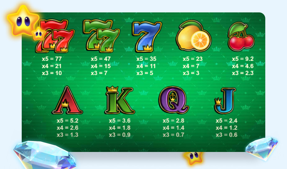 Zoals gezegd maakt Red Tiger bij dit videoslot gebruik van klassieke symbolen. De basissymbolen zijn kaartsymbolen. De J, de Q, de K en de A. De premiumsymbolen zijn kersen, citroenen, de blauwe zeven, de twee groene zevens en de drie rode zevens. Bekijk hieronder de uitbetalingstabel van 777 Strike: