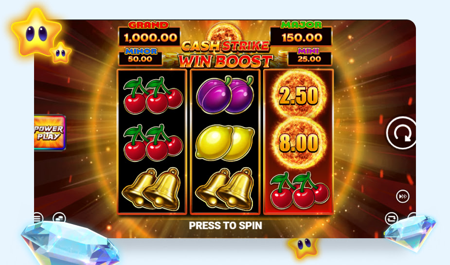 Cash Strike Win Boost is een eenvoudige gokkast met een Cash Collect bonusronde. Het spel bestaat uit een speelveld van drie rollen breed en drie rijen hoog. Over het veld lopen vijf vaste winlijnen. Winnende combinaties bestaan altijd uit drie dezelfde uitbetalende symbolen naast elkaar op zo’n winlijn.