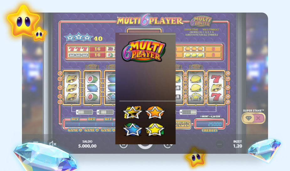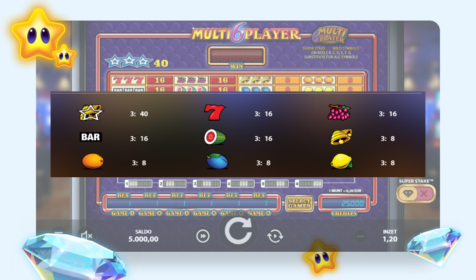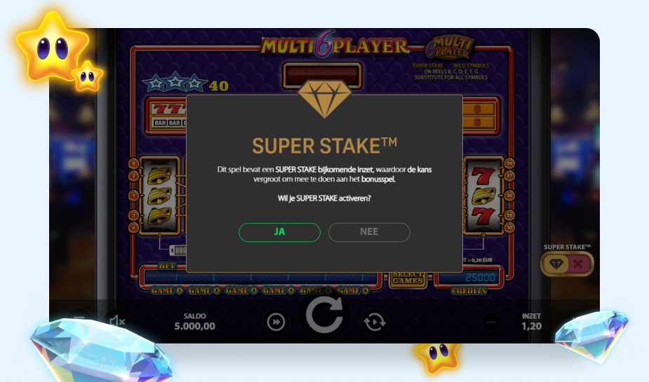 “De features van Multi 6 Player zijn in mijn ogen wel een toevoeging aan het spel. Dat je kans maakt op een progressieve jackpot op een willekeurig moment tijdens het spelen, dat verhoogt altijd de spanning. Daarbij zorgt de Super Stake feature ervoor dat de Wilds actief worden. Een combinatie met 3 wilds leveren net zoveel op als een combinatie met drie sterren. Daarbij zijn de wilds handig als joker. Doordat je sowieso op acht rollen speelt met 30 winlijnen, wordt de kans op winnende combinatie met actieve wilds wel wat groter dan als je zonder Super Stake speelt. Wees je er alleen goed bewust van dat de inleg dus verdubbeld wordt als je gebruikmaakt van de Super Stake optie.”