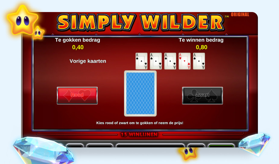 De meeste online fruitautomaten hebben wel een ‘Gamble Feature’ ingebouwd. Dit geeft je de mogelijkheid om je winst te verdubbelen. Dit kan zelfs meerdere keren na elkaar. Het risico hiervan is dat je ook je winst gelijk weer helemaal kwijt kan raken. Tijdens het spelen van Simply Wilder kreeg ik een aantal keer de mogelijkheid om mijn winst te verdubbelen na een winnende combinatie. Een aantal keer lukte het en een aantal keer niet. Bij sommige fruitautomaten kan je niet alleen kiezen tussen de kleur van de kaart om je inzet te verdubbelen, maar kan je ook nog kiezen welke soort kaart er komt. Als je bijvoorbeeld kiest voor een schoppen kaart en je hebt het goed, word je winst gelijk verviervoudigd. Deze optie zit helaas niet ingebouwd bij Simply Wilder. Dat had van mij wel gemogen, omdat het net wat meer spanning en opties geeft.