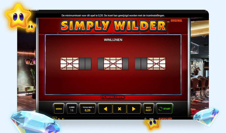 Simply Wilder is een gokkast die sinds 18 juni 2020 te spelen is in online casino’s. De minimale inzet ligt bij alle legale Nederlandse casino’s, die Simply Wilder aanbieden, op € 0,20 per draai. Wat je maximaal per draai kan inzetten, dat verschilt nogal per casino. Hieronder een tabel met een aantal voorbeelden van het maximale bedrag per draai bij een aantal legale aanbieders: