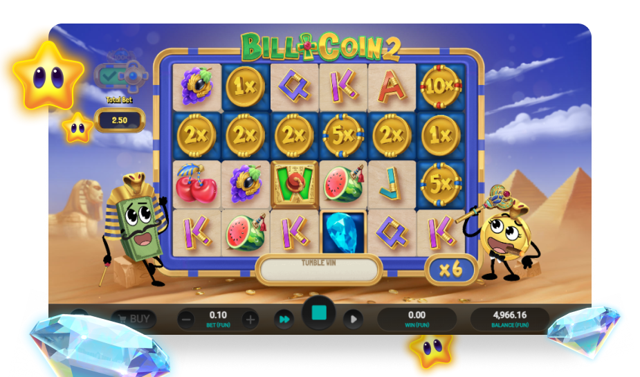 In Bill & Coin 2 ga je samen met een bankbiljet en een munt op avontuur in Egypte. Het klinkt misschien gek, maar deze twee grappige figuren zijn al eerder in een gokkast verschenen. Dit keer hebben ze een nieuwe vriend bij zich: een hondje met het lijf van een dobbelsteen. Samen gaan ze op zoek naar schatten in een oude piramide.