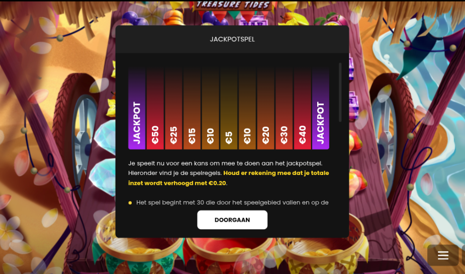 Als je dat gedaan hebt, wordt elke spin die je draait € 0,20 duurder. Deze jackpot inzet komt bovenop je normale inzet. Deze extra inzet is de bijdrage die je doet aan de jackpot en wordt toegevoegd aan de jackpot die je kunt winnen.