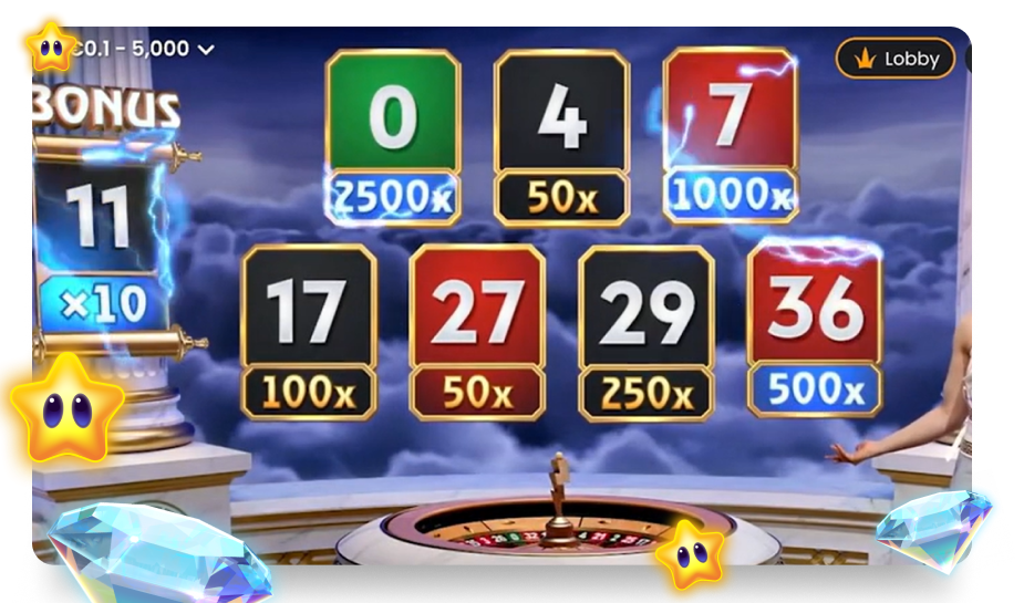 In elke ronde wordt ook één bonusgetal geselecteerd. Als het balletje op dat nummer valt en jij hebt erop ingezet, start de bonusronde. In deze bonus speel je 15 free spins op een speelveld dat lijkt op de gokkast Gates of Olympus. Winsten worden hier bepaald door multipliers in plaats van vaste uitbetalingen.