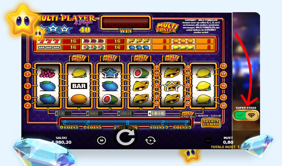 1. De wilds worden bij Multiplayer 4 Player alleen actief als je in de Super Stake modus speelt. Door de wilds krijg je eerder winnende combinaties en lukt het je om een combinatie van drie wilds te maken, betaalt dit hetzelfde uit als drie sterren.