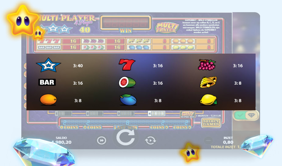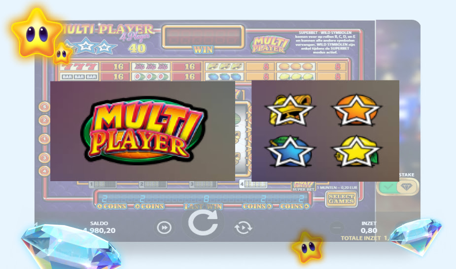 De MultiPlayer gokkast heeft een hoofdprijs van 24.000 euro per spin. De kast heeft een uitbetalingspercentage van 95,49%. De speler kan maximaal 4.000 credits inzetten, en één credit kost 0,20 eurocent. Dat betekent dat je maximale inzet tot 400 euro per spin bedraagt.
