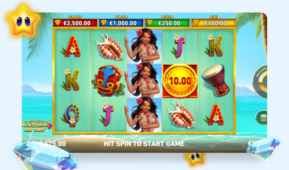 Alohawaii: Cash Collect is een videoslot met een speelveld van 5×3. Over de vijf rollen lopen dertig vaste winlijnen. Winnende combinaties moeten aan de linkerkant van het speelveld beginnen en naast elkaar op zo’n winlijn staan om uit te betalen. Het wild symbool kan de normaal uitbetalende symbolen vervangen, waardoor er meer of langere winnende combinaties kunnen ontstaan.