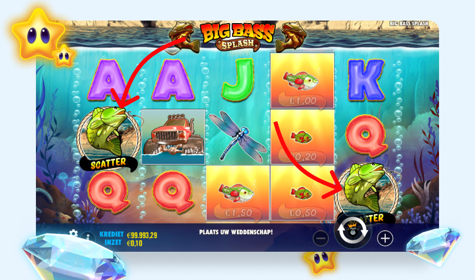 Bij Big Bass Splash zijn er nog twee belangrijke symbolen. Het gaat om het wild-symbool (de visser) en het scatter-symbool (een grote groene vis). Het wild-symbool wordt pas actief in de free-spins bonusronde. De scatters zijn het hele spel actief.