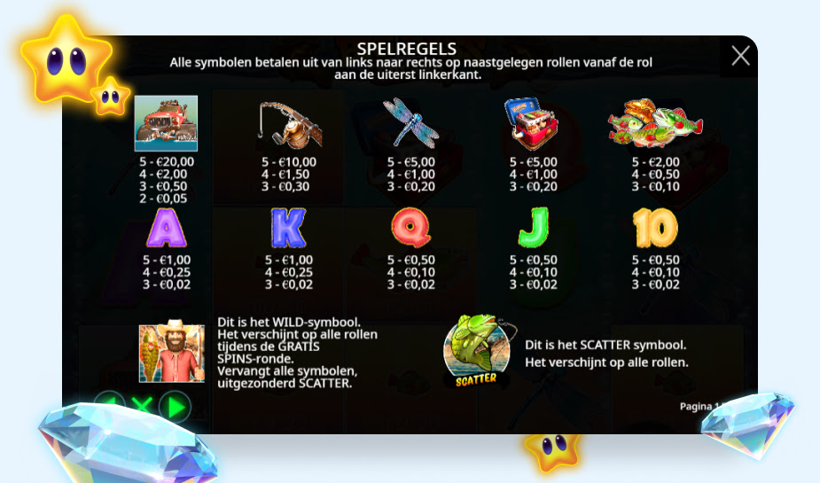 De wild-symbolen (de visser) verschijnen vaker tijdens de freespins. De visser is erg belangrijk omdat hij de vissen met geldprijzen verzamelt en helpt om sneller naar hogere levels te gaan.