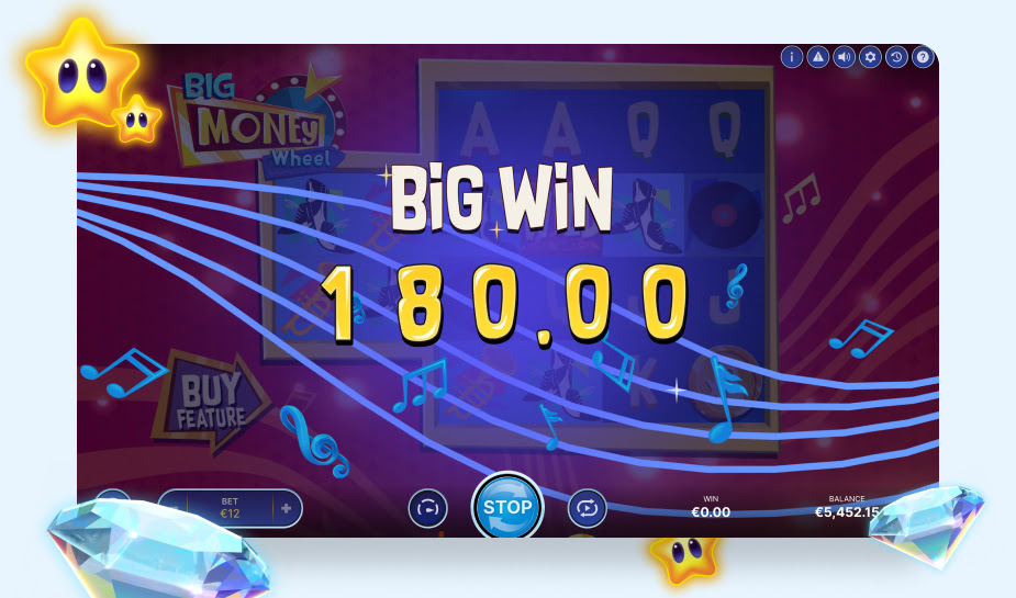 NetEnt heeft Big Money Wheel een retro uitstraling gegeven. Het spel heeft kleurrijke graphics en een fijne sfeer. Symbolen zoals langspeelplaten, trompetten en dansschoenen geven het spel een muzikaal tintje. Prettige achtergrondmuziek ontbreekt dan ook zeker niet. De videoslot heeft een relatief simpele achtergrond, met bewegende muzieknoten en glinsterende details. Hierdoor wordt je aandacht al snel naar het speelveld getrokken. Al met al heeft NetEnt met Big Money Wheel visueel een fijn spel afgeleverd.