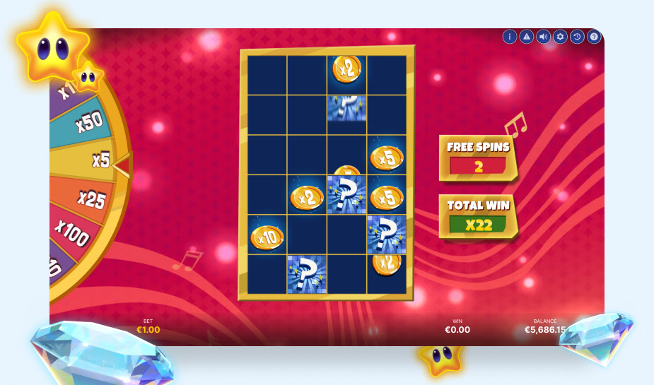- Eindigt het rad op een multiplier? Dan krijgen alle mystery symbolen een waarde tussen de x5 en x1000.