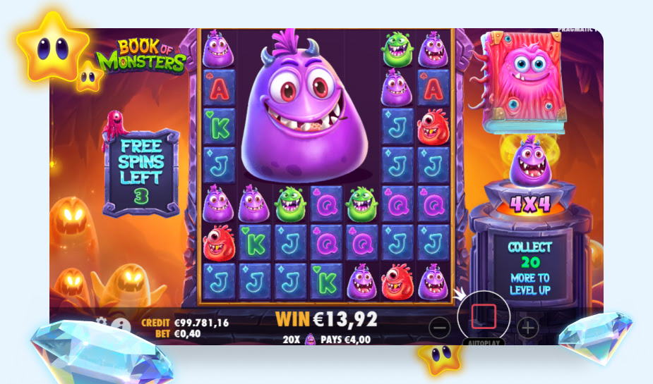 Book of Monsters is een casino game dat niet moeilijk is om te begrijpen. Wel kan het zijn dat je misschien nog niet precies weet wat het ‘Cluster Pays’ principe inhoudt. Dit betekent dat je geen vaste winlijnen hebt om winnende combinaties op te maken. Maar je speelt met ‘clusters’, dit zijn minimaal vijf dezelfde aangrenzende symbolen.