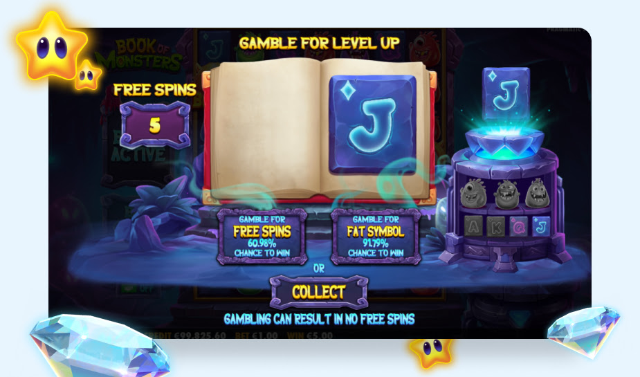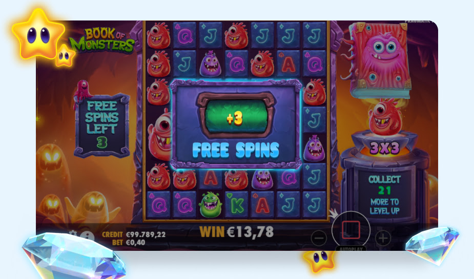 Het bonusspel van Book of Monsters is eigenlijk heel simpel, maar er zijn precies de juiste elementen in toegevoegd om het interessant te maken. Door de verzamelfunctie maak je continu kans om een re-trigger te activeren. Het leuke hiervan is dat je bij elke re-trigger direct een level up ontgrendeld hebt waardoor je met een groter symbool gaat spelen. Dit kan natuurlijk weer zorgen voor hogere potentiële uitbetalingen.