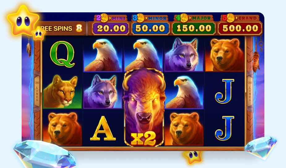 Als je drie scatters op het speelveld van Buffalo Power: Hold and Win draait, activeer je de free spins bonusronde. Je krijgt acht gratis spins toegekend. Tijdens die spins bevatten de gestapelde wilds een multiplier van x2. Elke winst waarbij de wild betrokken is, wordt met die multiplier verhoogd.