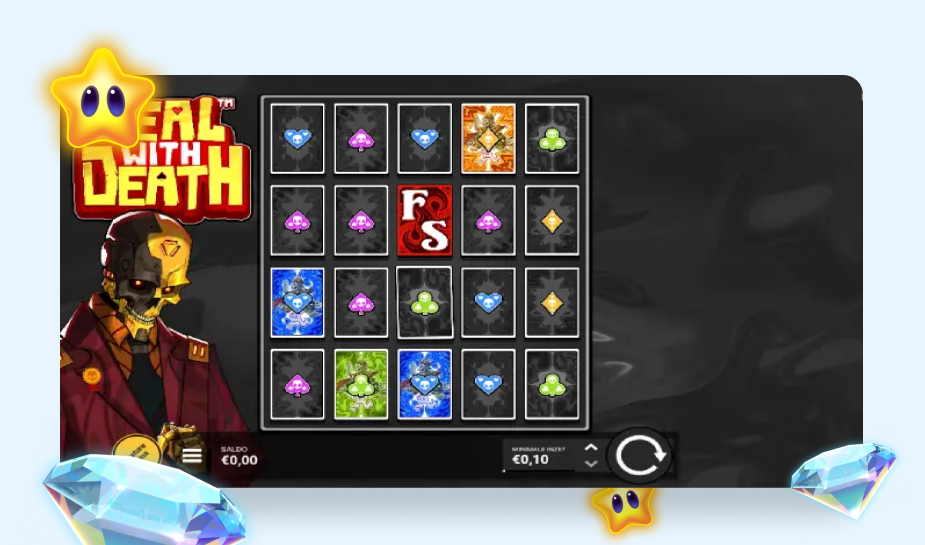 Deal With Death is een video slot met een flinke twist in de gameplay. Naast een spel met winlijnen kent het basisspel een poker modus. Wanneer er een joker symbool op de rollen gedraaid wordt, draait het speelveld om en worden er speelkaarten getoond.