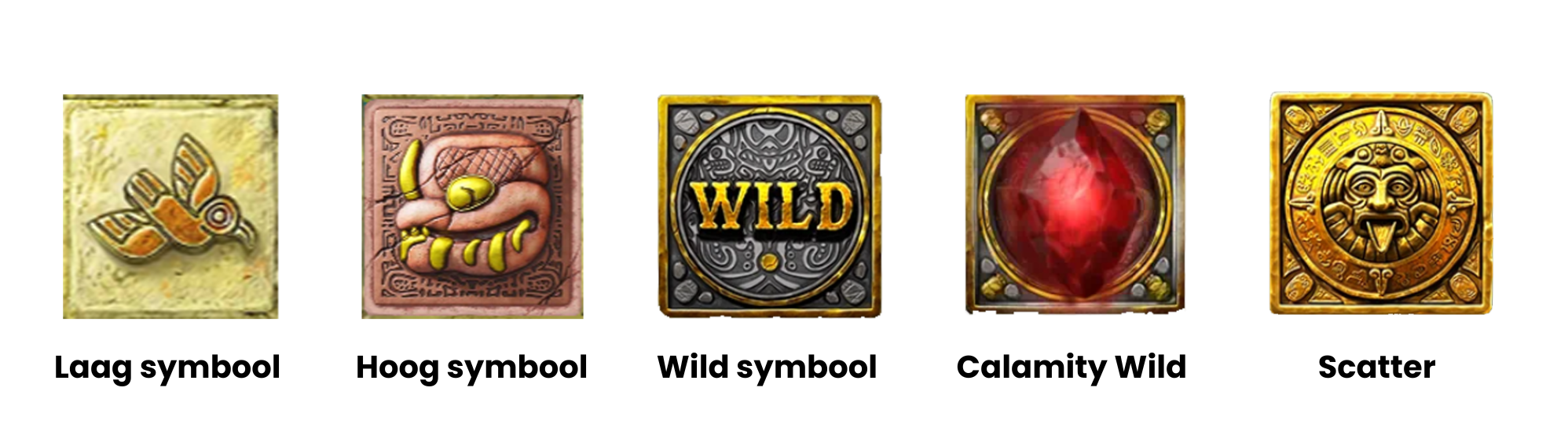 - Symbolen: er zijn symbolen met een lagere waarde, hogere waarde, wilds, calamity wilds en scatters.