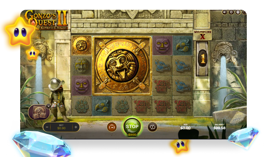 Gonzo is een bekende naam in de wereld van online gokkasten. De avonturier gaat al jaren op pad, op zoek naar schatten. Deze tocht zet hij voort en nu keert Gonzo terug in El Dorado. Ga samen het avontuur aan in Gonzo's Quest 2: Return to El Dorado.