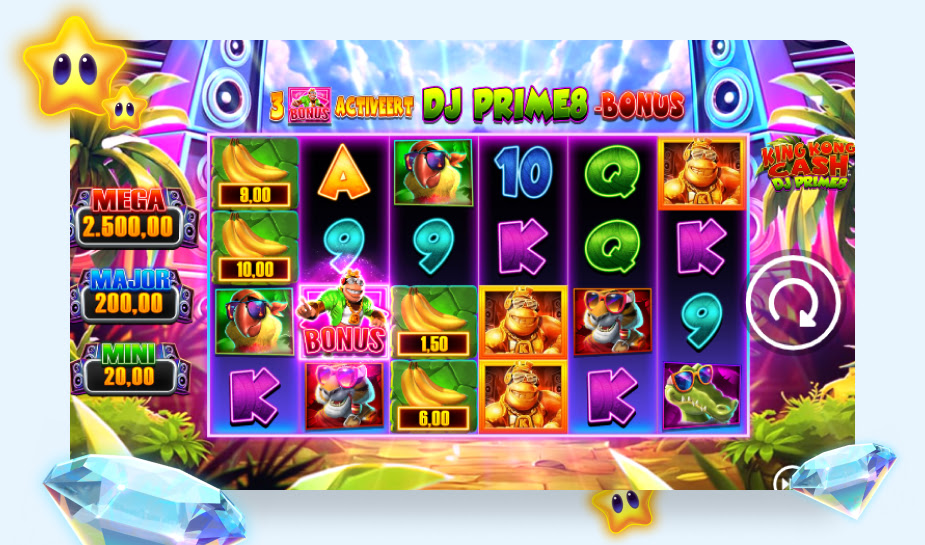 In King Kong Cash DJ Prime8 mag je uit twee verschillende bonusrondes kiezen. Draai minimaal drie bonus scatters op het veld om de bonus te activeren. Vervolgens kies je uit de twee opties, waarna je de gekozen bonus speelt.