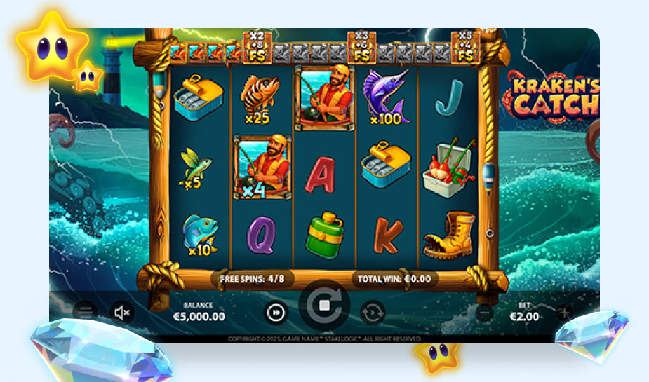 Stakelogic heeft Kraken’s Catch een spannend thema gegeven. Het vis-thema van dit spel krijgt door de toevoeging van de indrukwekkende Kraken een spannende twist. Je ziet de monsterlijke mythische wezen nooit volledig, maar zijn tentakels en oog schetsen een angstaanjagend beeld. De woelige zee op de achtergrond en de aanzwellende achtergrondmuziek dragen ook bij aan deze sfeer.