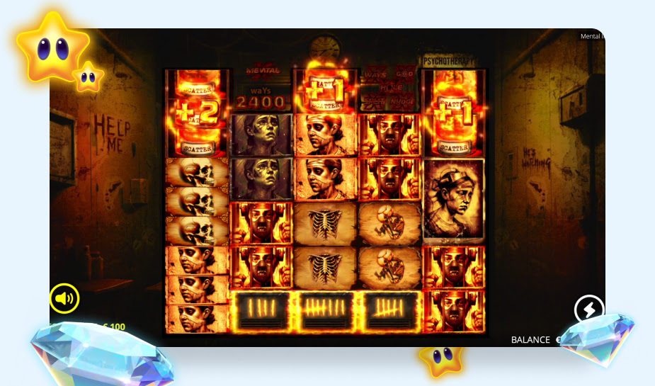 In Mental 2 bouwt NoLimit City verder op het thema dat ze in het originele Mental spel hebben neergezet. Je bevindt je in Mental 2 in een gekkenhuis, waar ze niet al te zachtzinnig met de patiënten omgaan. Het donkere thema is uitgewerkt in gedetailleerde, ietwat verontrustende, graphics. Niet alle spelers zullen dit uitgesproken thema kunnen waarderen, maar NoLimit City levert grafisch gezien in ieder geval een interessant en uniek spel af. Aan het begin van het spel krijg je een waarschuwing te zien over de verontrustende graphics die je in de slot tegen zult komen. Speel het spel dus alleen als je daar tegen kunt.
