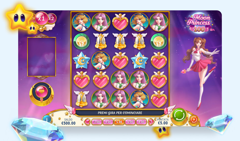In Moon Princess 100 casino game spelen de prinsessen Love, Star en Storm de hoofdrol. Elke beurt is er één van deze dames naast het speelveld zichtbaar. Elk van deze prinsessen heeft een eigen superkracht die ze willekeurig in een niet-winnende beurt kan inzetten.