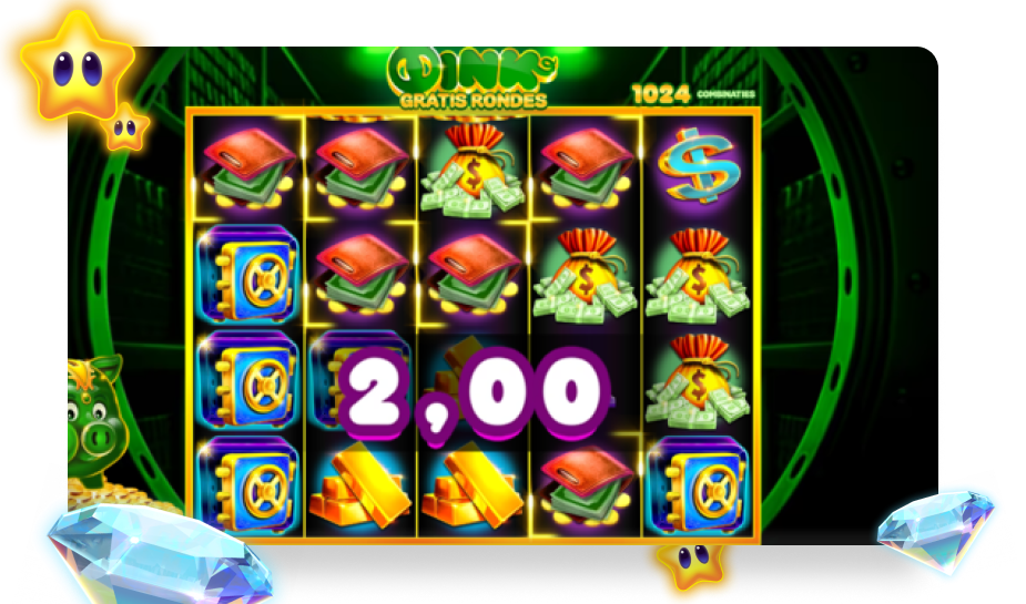 🟢Groen spaarvarken: start free spins. Tijdens deze spins levert elke groene munt één extra spin op. Je krijgt 6, 8 of 10 free spins. Je kunt ook nog veel meer winmanieren krijgen en je krijgt een groter speelveld.