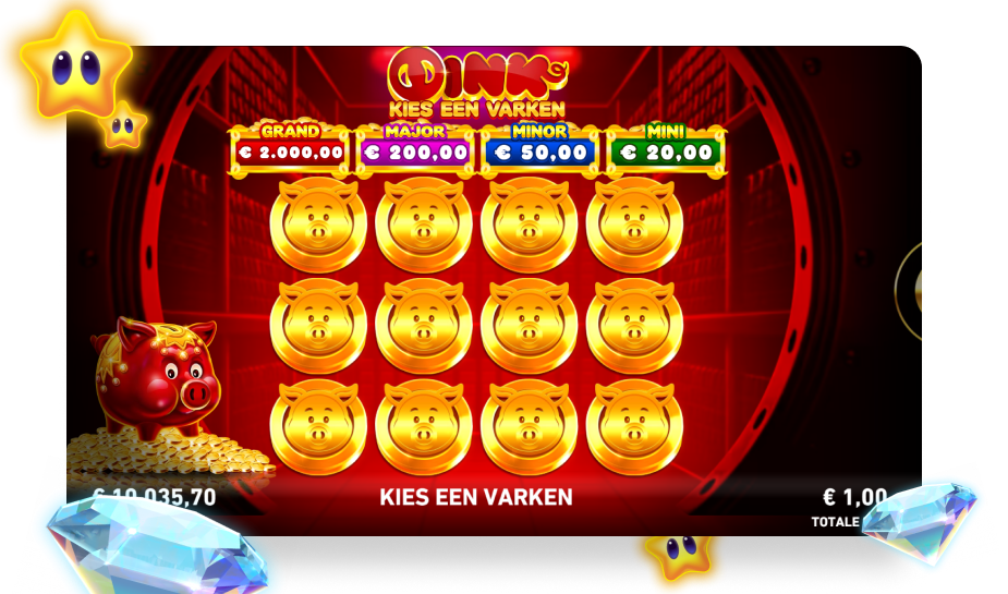 Kies gouden varkens tot je 3 dezelfde jackpotlabels hebt (Mini, Minor, Major, Grand).Jackpots