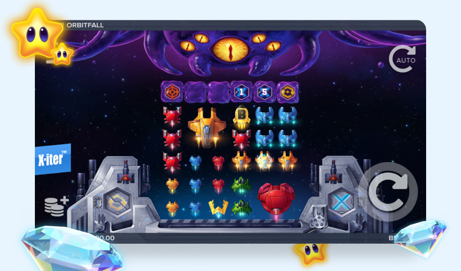Orbitfall is een videoslot met een gemiddelde volatiliteit. Het spel wordt gespeeld met een inzet tussen de € 0,20 en € 100 per spin. Daarmee maak je kans op maximaal 7500x je inzet. Dat betekent een winst tussen de € 1500 en € 750.000 afhankelijk van de inzet waar je mee speelt.
