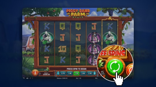 Het speelveld van Piggy Bank Farm heeft vijf rollen en vier rijen. Over deze twintig symbolen staan vijftig vaste winlijnen verdeeld, die allemaal van links naar rechts werken en minimaal drie symbolen op rij nodig hebben. Alle combinaties in beeld worden opgeteld voor een overzicht van de winst uit die spin. De boer werkt mee als wildsymbool, die alle andere symbolen vervangt. Door een hamer op de laatste rol te zetten, begint de speler de Piggy Bank Spins; dit kan op ieder moment (en is in het begin wat vreemd, omdat het lijkt alsof er een derde scatter aan zit te komen).
