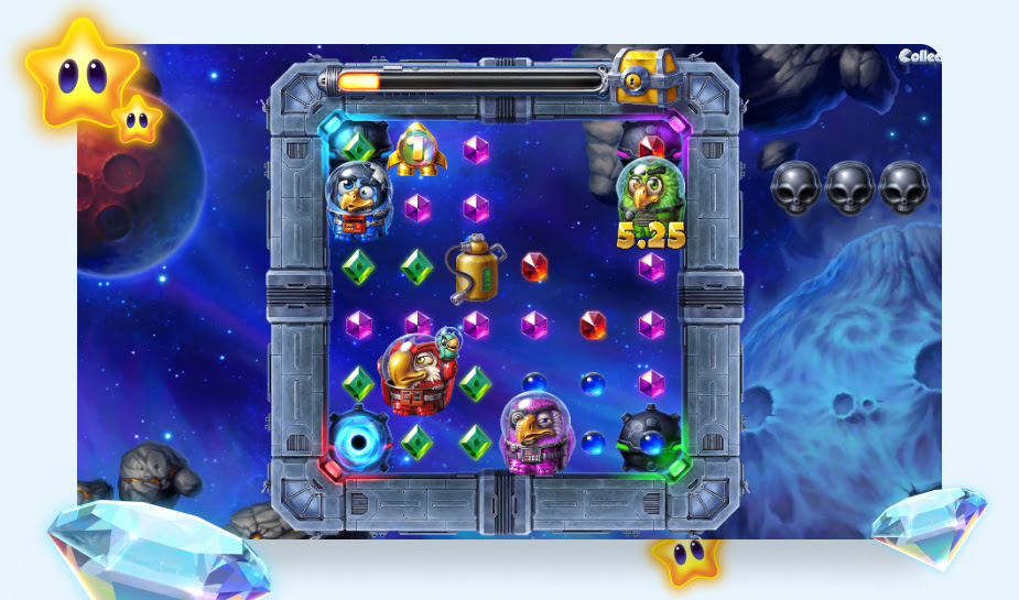 Wanneer de bom ontploft, zal de bom ook een verbonden ruimtestation sectie verwijderen. Hoek bommen kunnen daardoor het speelveld vergroten tot maximaal 8×8 kolommen. Symbolen vallen verticaal tot ze een positie hebben bereikt en nieuwe symbolen vallen van bovenaf om lege posities te vullen en de vogels komen weer terug.