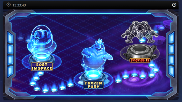 Wanneer Lost in Space gestart wordt, begin je direct met 8×8 kolommen en één vogel in elke hoek. 3 drops worden gegeven. Door meerdere munten of brug symbolen op het speelveld te krijgen, zal de teller weer naar 3 drops teruggezet worden.