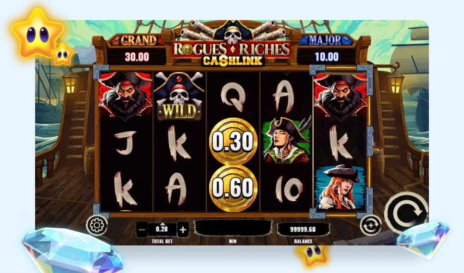 In Rogues Riches Cashlink stap je aan boord van een piratenschip. Hier kom je, naast woeste piraten, een Cashlink mechanisme tegen. Draai een collect symbolen en geldsymbolen op het veld en de geldprijzen worden toegekend. Draai je ook nog een pistool of kanon op de eerste rol? Dan worden één of meerdere geldprijzen verhoogd met een multiplier. Videoslots met een soortgelijk mechanisme doen het vaak goed in de Nederlandse online casino’s.