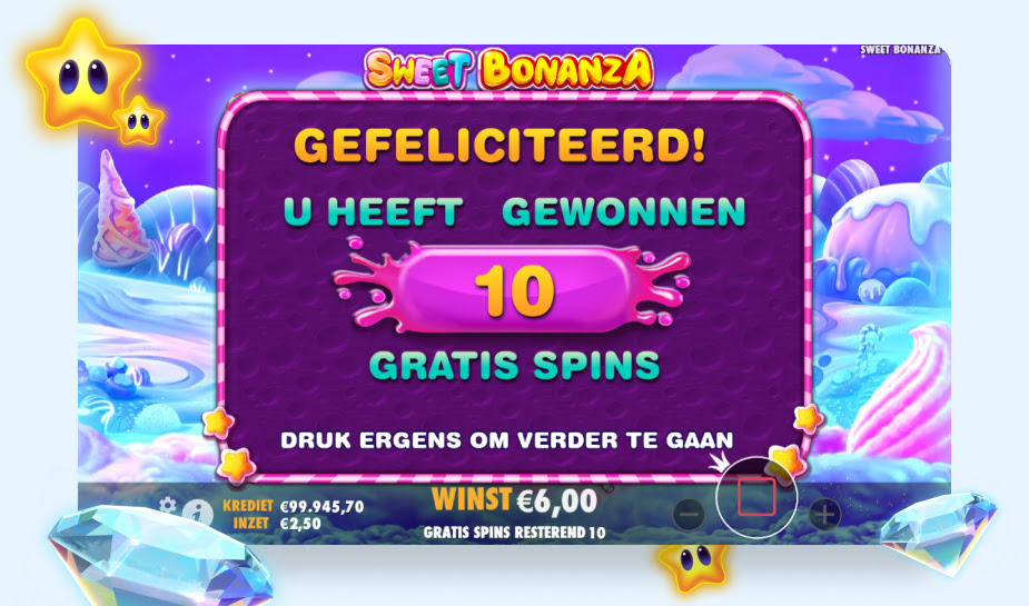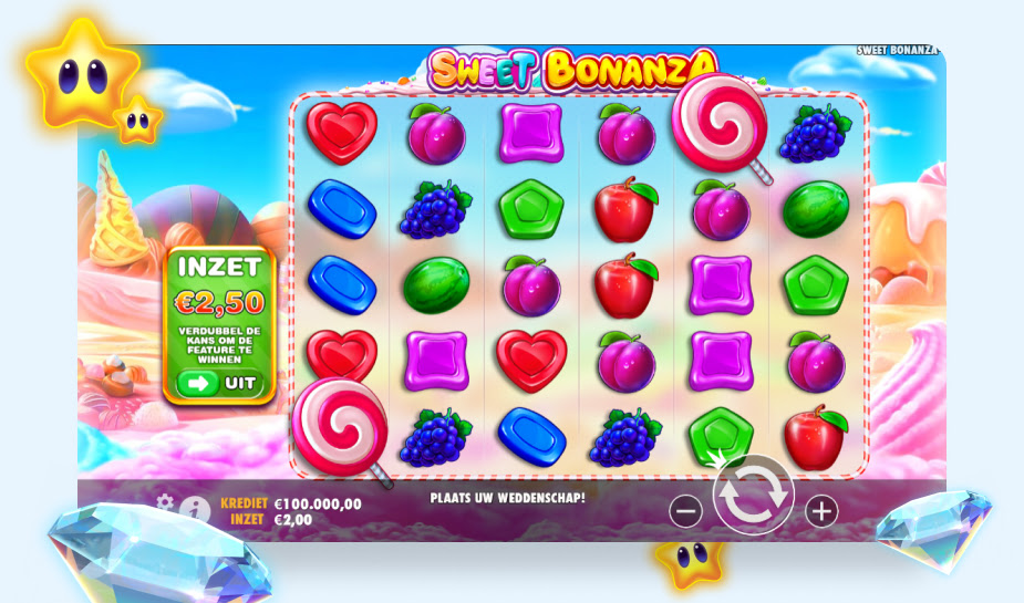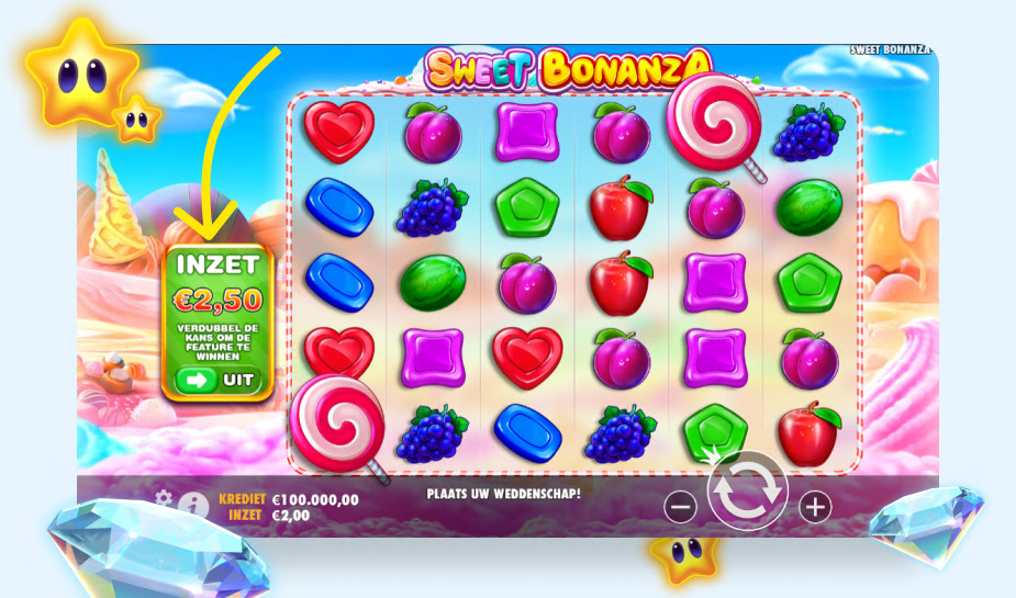 Bij sommige gokkasten kun je spelen met een extra inzet van 25% per draai om je kansen op scatters te vergroten. Dit is geen bonusbuy (die is in Nederland niet toegestaan), maar een functie die wel legaal is bij Nederlandse goksites. Je vindt deze optie aan de linkerkant van het scherm bij Sweet Bonanza. Als je de functie inschakelt, betaal je per spin iets meer, maar heb je een grotere kans om scatters te draaien. Met minimaal 4 scatters kom je in de bonusronde, waar je 10 gratis spins krijgt en multipliers actief worden.