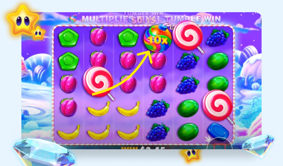 In Sweet Bonanza speel je op een veld van 6 bij 5 symbolen. Je wint zodra er minstens acht dezelfde symbolen tegelijk in beeld staan.