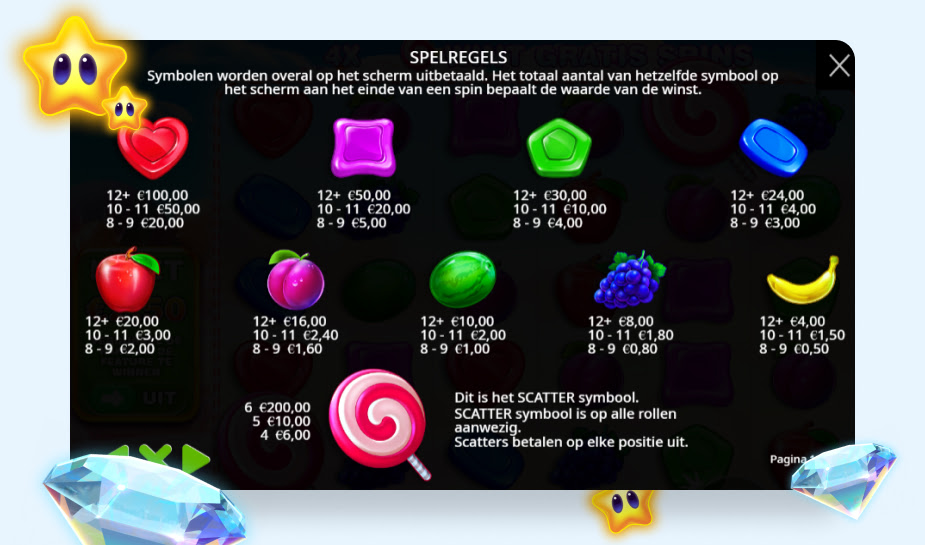 Dit zijn symbolen waarmee spelers hogere winsten kunnen behalen en dit zijn de snoepjes. Het rode snoepje heeft de hoogste waarde, gevolgd door het roze, de groene en het blauwe snoepje. Ook hier geldt hetzelfde als bij de edelstenen: er moeten minimaal acht gelijke symbolen in beeld komen, met een maximum van 30 identieke symbolen. Hieronder tref je een afbeelding van de uitbetalingstabel per symbool.