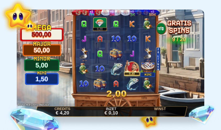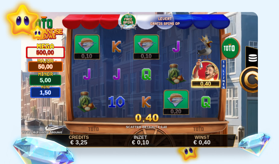 TOTO Hollandse Nieuwe is een videoslot met winlijnen. Je kunt geld winnen door winnende combinaties van symbolen te maken. Daarnaast worden er cashprijzen en jackpots geïnd, zowel in het basisspel als in de bonusronde.
