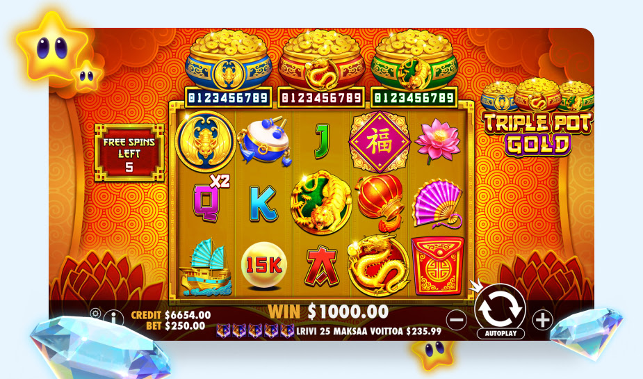 Triple Pot Gold is een videoslot met een Aziatisch thema. In dit spel van Pragmatic Play draait alles om drie grote potten goud die boven het speelveld te vinden zijn. In die potten worden scatters verzameld. Bij elke pot hoort een eigen scatter, die een eigen bonusronde modifier heeft. Als je geluk hebt, speel je de bonusronde van Triple Pot Gold met alle drie die modifiers.