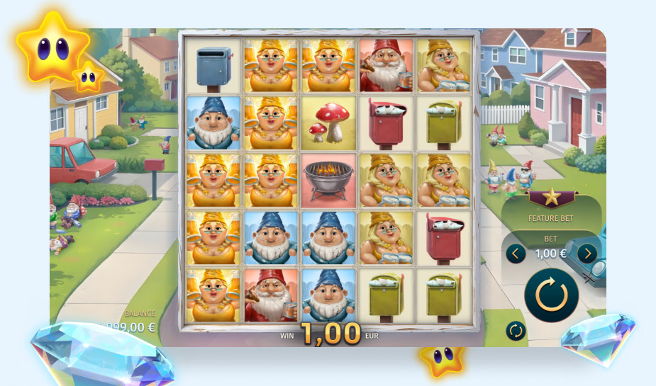 Het veld van dit casino spel is over het algemeen gevuld met brievenbussen, barbecues en verschillende tuinkabouters. Af en toe valt ook de boze buurman Uncle Profit op het veld. Als dat tijdens een winnende spin gebeurt, verandert hij alle winnende symbolen in munten. Die munten worden vervolgens verzameld en uitbetaald.
