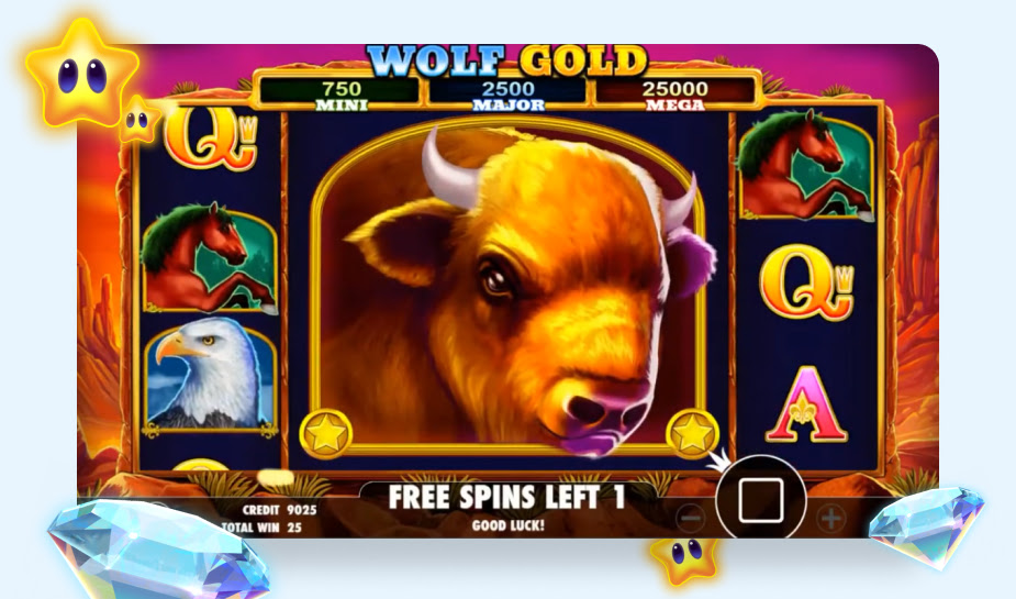 Naast de wilds zijn er ook nog scatters van de partij in Wolf Gold. Dit is een afbeelding van “Monument Valley”. Het wereldberoemde woestijnlandschap in het zuidwesten van de Verenigde Staten. Het scatter-symbool kan alleen verschijnen op de rollen 1, 3 en 5. Heb je drie scatters, dan geeft dit toegang tot de free spins bonusronde. De drie scatters zelf geven ook een uitbetaling van 1x je inzet. Scatters kunnen niet gestapeld op de rollen komen.