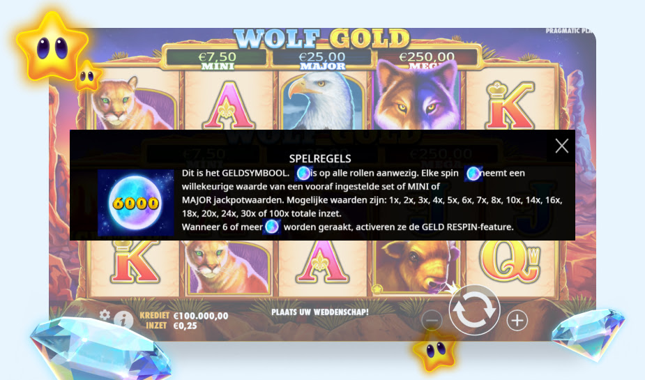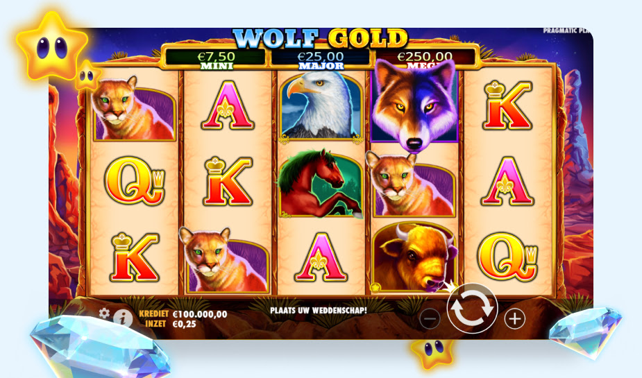 Het RTP-percentage bij Nederlandse online casino’s is wel echt aan de lage kant. Met 93.99% is dit meer dan 2 procentpunten lager dan het landelijk gemiddelde. Wil je deze gokkast met geld spelen? Op deze pagina tref je een top 5 van casino’s die het spel sowieso in het spelaanbod hebben en die wij adviseren. Voor het gratis uitproberen ben je op deze pagina aan het juiste adres. Zonder registratie en met fictief saldo, kan je Wolf Gold uitproberen.”