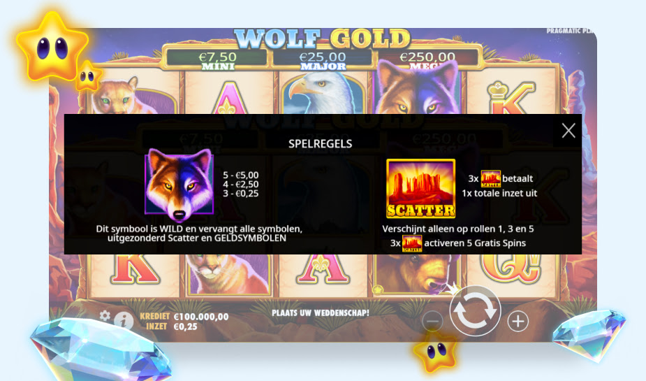 Om een beter beeld te krijgen van hoe Wolf Gold presteert, heb ik 50 spins gedraaid met een inzet van €0,25 per spin. Dit aantal spins geeft een redelijke indicatie van hoe vaak features voorkomen, hoe de uitbetalingen zich opstapelen, en hoe spannend het spel blijft tijdens een gemiddelde speelsessie.