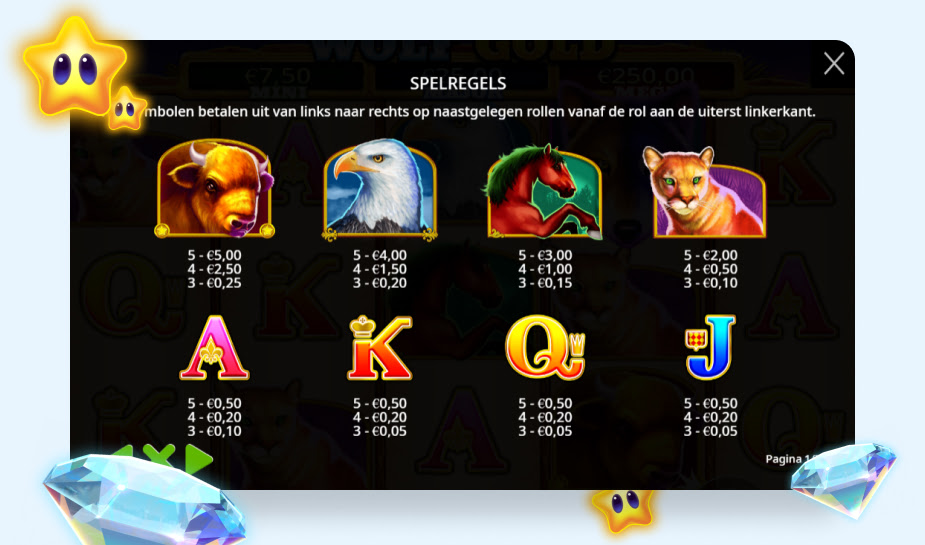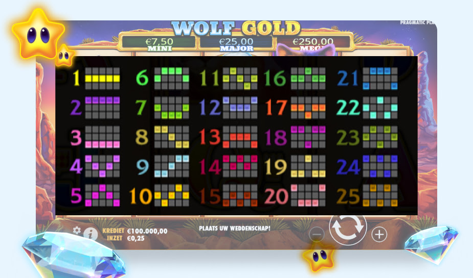De gokkast wordt gespeeld met 5 rollen die elk 3 rijen bevatten. Er zijn 25 vaste winlijnen waar je winnende combinaties op moet zien te krijgen. Alle symbolen betalen alleen uit van links naar rechts bij Wolf Gold. Er zijn minimaal drie identieke symbolen op een winlijn vereist voor een uitbetaling. De minimale inzet bij Wolf Gold ligt bij Nederlandse online goksites overal gelijk en is vastgesteld op € 0,25 per draai. De maximale inzet per draai, die vooral voor high-rollers interessant is, loopt nogal uiteen bij casino’s. Hetzelfde geldt voor het uitkeringspercentage voor Wolf Gold. Officieel is dit vastgesteld op 96%. De praktijk wijst echter uit dat er veel casino’s zijn die het spel tegen een lager percentage aanbieden. Hieronder een aantal voorbeelden van de verschillende qua RTP en maximale inzet per draai bij Nederlandse casino’s:
