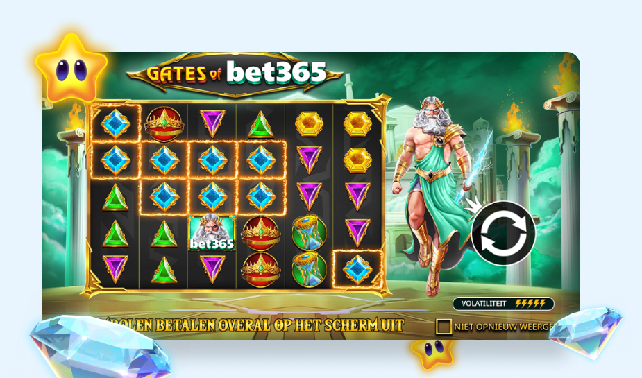 Gates of Olympus is niet alleen een populair spel van zichzelf, maar het spel wordt ook vaak gebruikt door casino's om een huismerk gokkast te maken. Dat heeft Bet365 ook gedaan. Gates of Bet365 heeft andere kleuren dan het origineel en het logo van het casino is in het scatter symbool verwerkt.