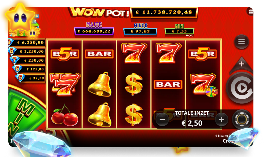 9 Blazing Diamonds WOWpot is een klassieke videoslot van Games Global. Het spel heeft vijf rollen, 24 winlijnen en gebruikt symbolen zoals BAR’s, bellen en rode zevens. Juist door die simpele opzet is het slot makkelijk te spelen, terwijl de focus volledig ligt op de grote jackpotprijzen.