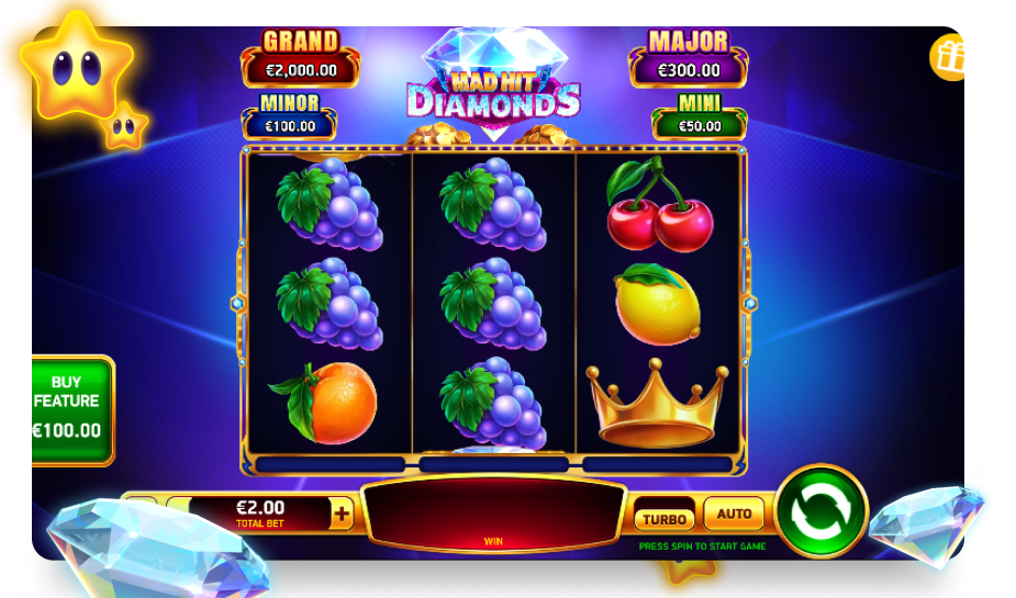 Mad Hit Diamonds is een spel dat in februari 2025 is uitgebracht door spelmaker RubyPlay. Het speelveld is klein en doet je denken aan een klassieke fruitautomaat. Je hebt vijf winlijnen waarop je winnende combinaties kunt maken.